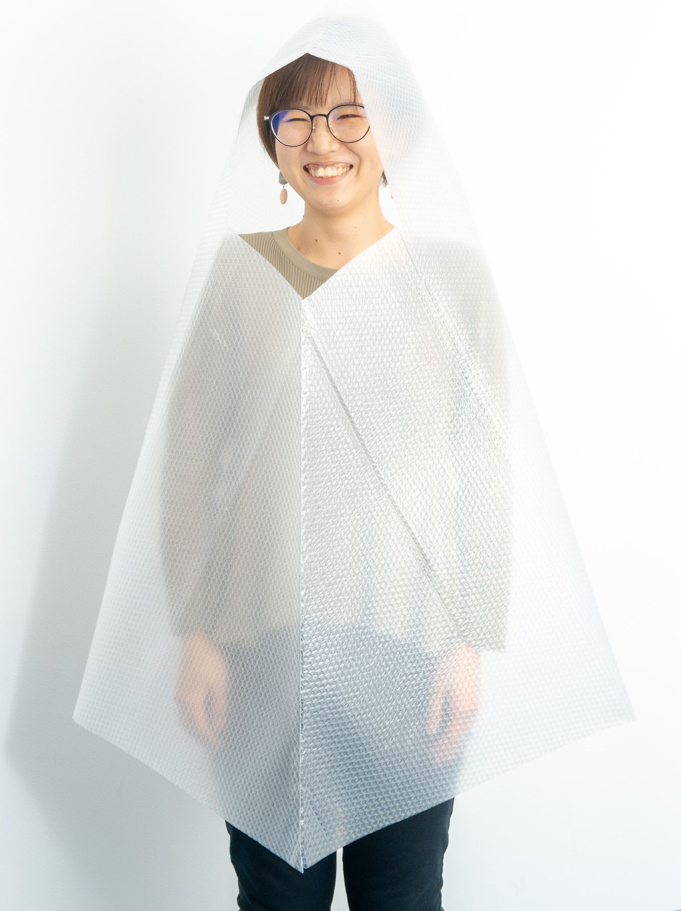 温かく、雨を凌げるポンチョ型プチプチ[撮影=横山翔平(t.cube)]