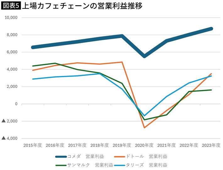 上場カフェチェーンの売上推移 各社IR資料より 単位:百万円(図表=筆者作成)