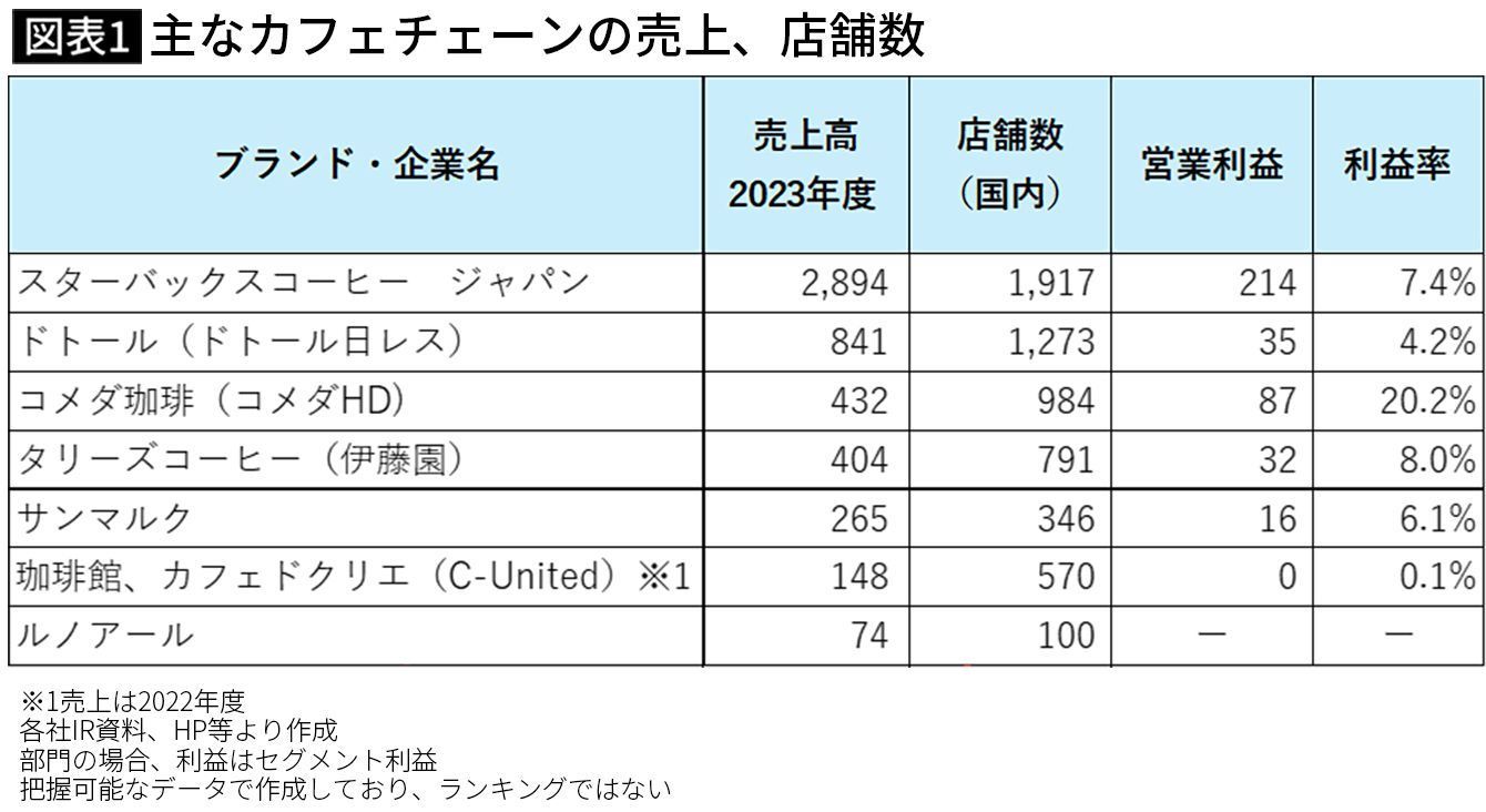 上場カフェチェーンの売上推移 各社IR資料より 単位:百万円(図表=筆者作成)