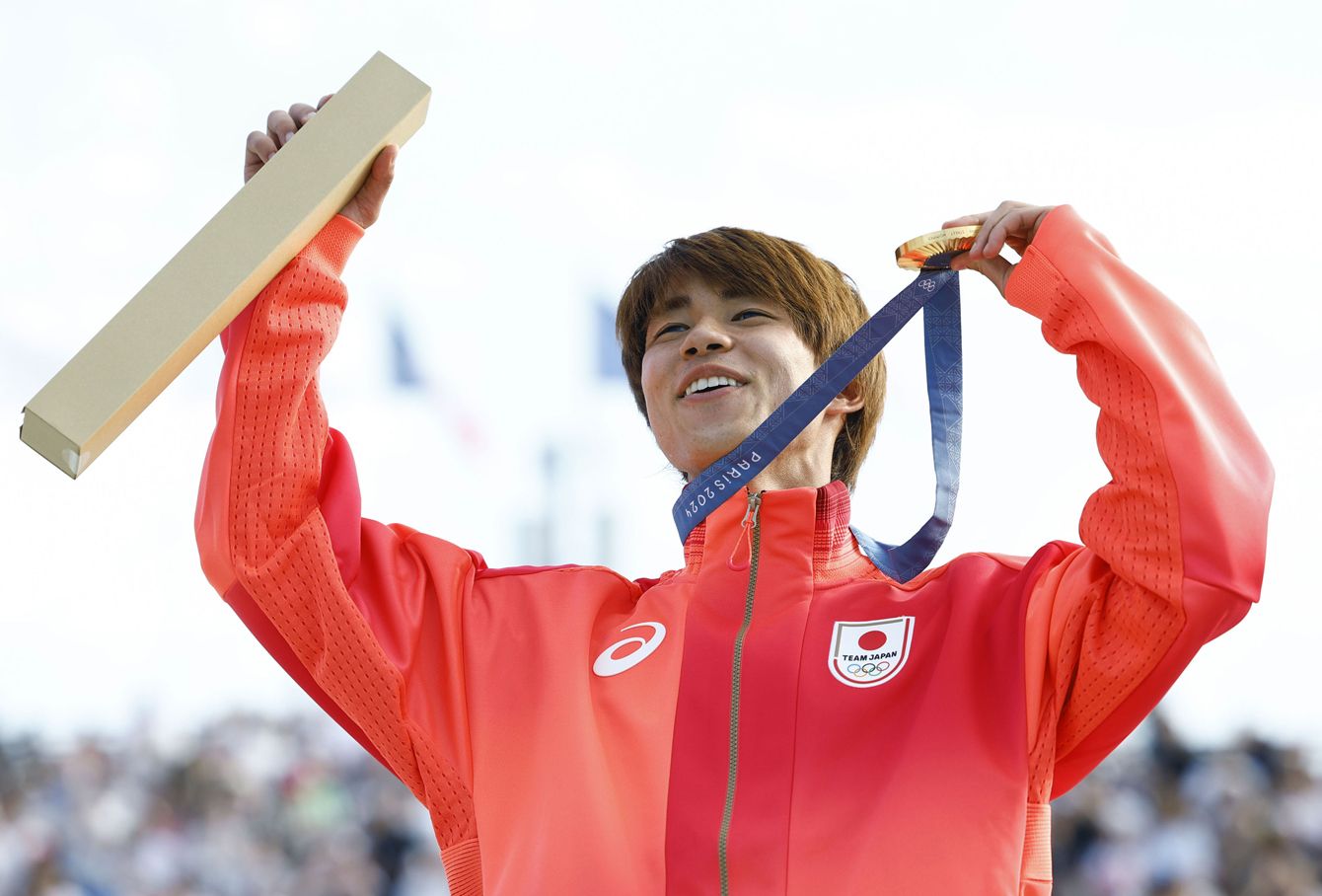 金メダルを手に喜ぶスケートボード男子ストリートの堀米雄斗。五輪2連覇を果たした(2024年7月29日、パリ)