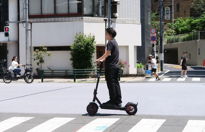 【写真6】ナンバープレート無しで公道を走行する電動キックボードは道交法違反