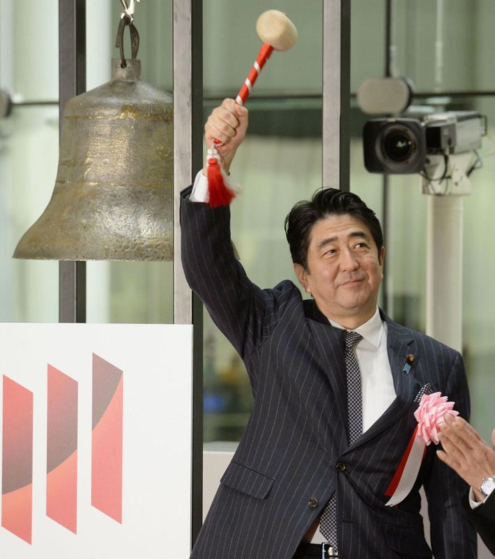 2013年12月30日、東京証券取引所の大納会で鐘を鳴らした安倍首相=東京・日本橋兜町