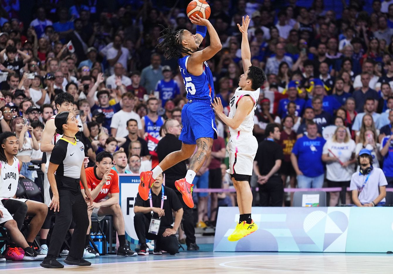 日本対フランス 第4クオーターの終了間際、フランス選手(左)を止めにいきファウルと判定された河村。3点シュートとフリースローを決められ同点に追いつかれた(フランス・リール)
