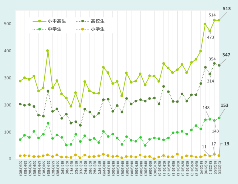 小・中・高生の自殺者数の推移。近年はSNS上での誹謗中傷が社会問題化している。