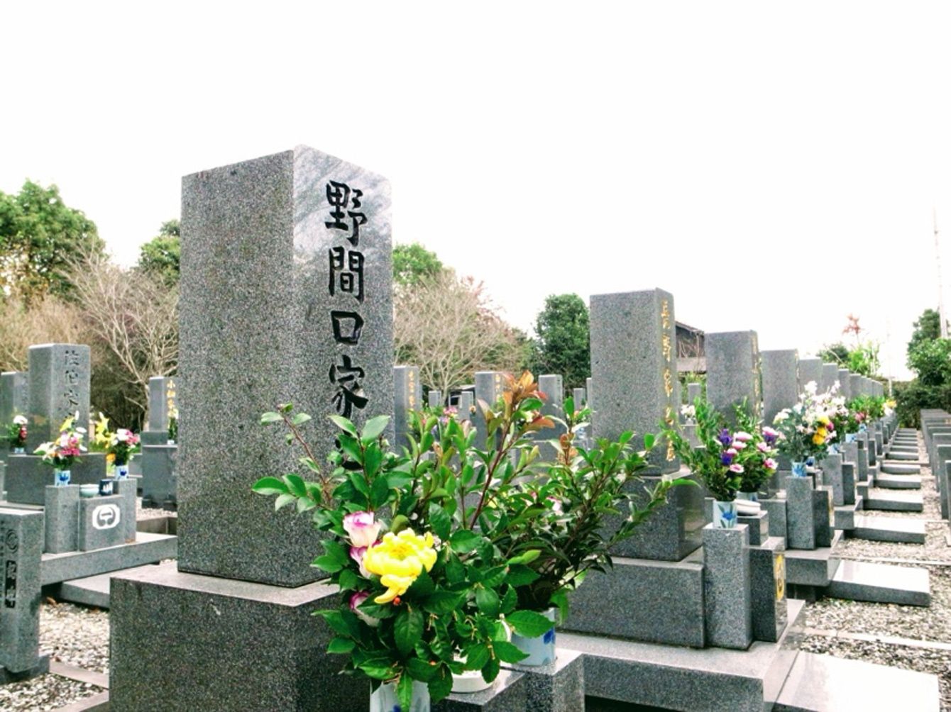 鹿児島県内の墓地で。どの墓にも生花がお供えされている。