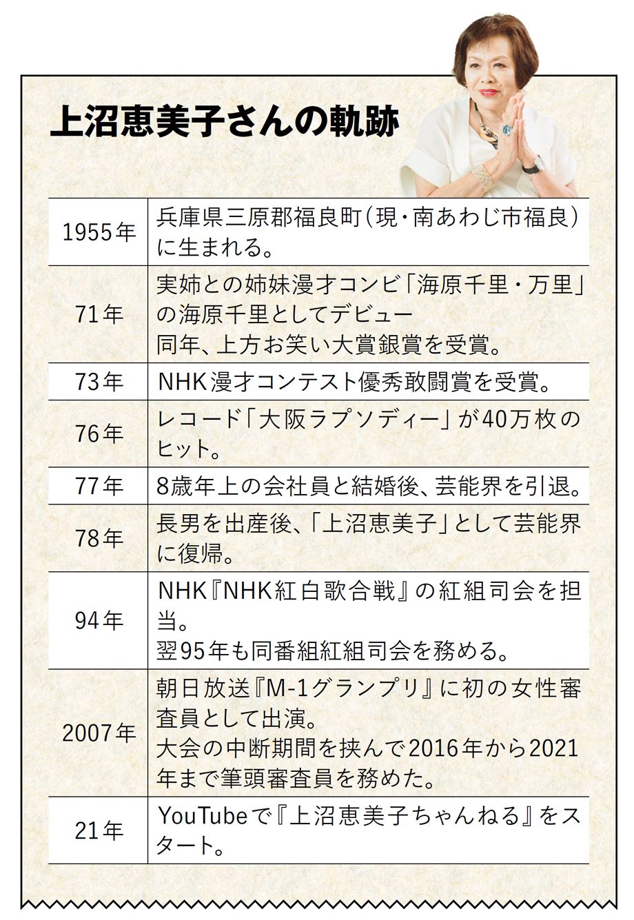 かみぬま・えみこ●1955年兵庫県生まれ。71年に姉妹漫才コンビ「海原千里・万里」の千里としてデビュー。77年に結婚後、芸能界を引退して専業主婦に。翌年、「上沼恵美子」として復帰。関西を中心にテレビやラジオで活躍。2021年から、YouTube公式チャンネル「上沼恵美子ちゃんねる」をスタート。