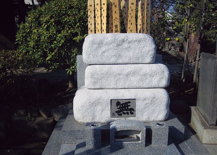 東京・谷中のとあるお寺に建てたお墓。中尾彬さんが自らデザイン。墓石は縦ではなくあえて横に寝かせた。