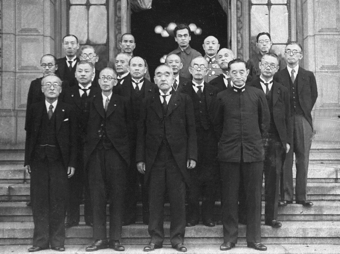 議会開院式を前に記念撮影する鈴木内閣閣僚=1945(昭和20)年6月9日、国会