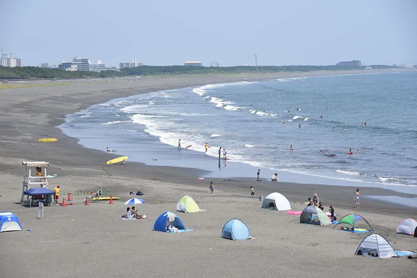白い波が砕波、沖の次の波までの間が砕波帯。写真左側に立っている男性を見ると、深さが成人の肩ぐらいということがわかる。水難学会指導員養成講習会で、5分間の背浮き実技訓練中。2012年9月、愛知県田原市