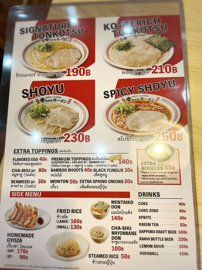 バンコク店の「豚骨ラーメン(190バーツ)」。福岡ではおなじみの青ねぎときくらげはトッピングで追加できる。円換算で一杯855円と日本よりも少し高い価格設定になっている