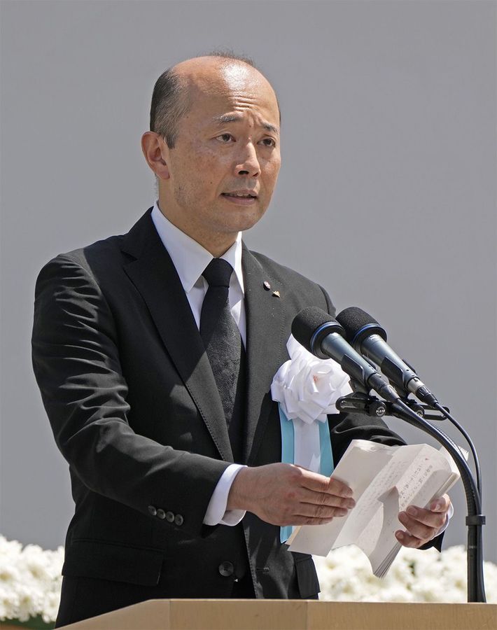 「長崎原爆犠牲者慰霊平和祈念式典」で平和宣言を読み上げる長崎市の鈴木史朗市長=2024年8月9日