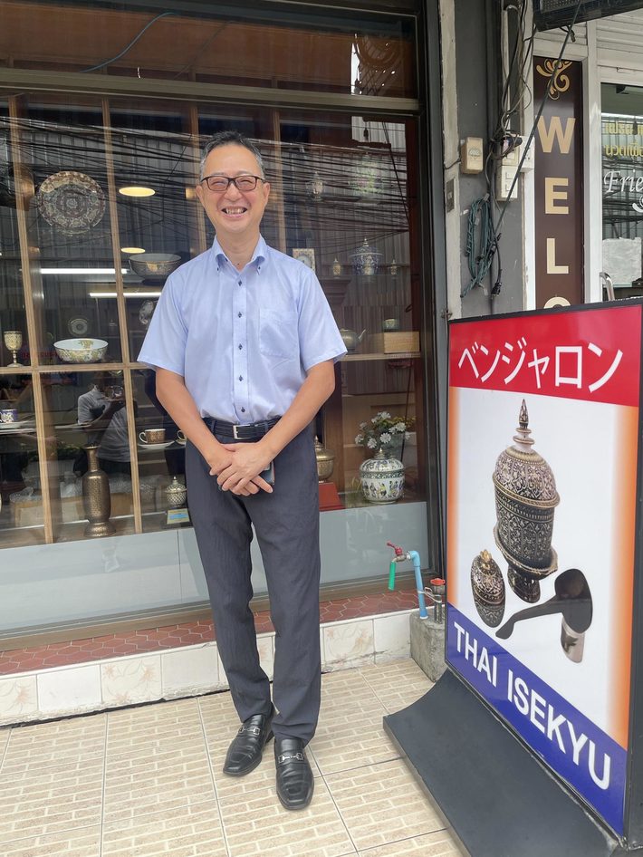 タイの伝統工芸品「ベンジャロン焼」を製造、販売するタイ・イセキュウ社長の野村学さん=2024年7月、バンコク