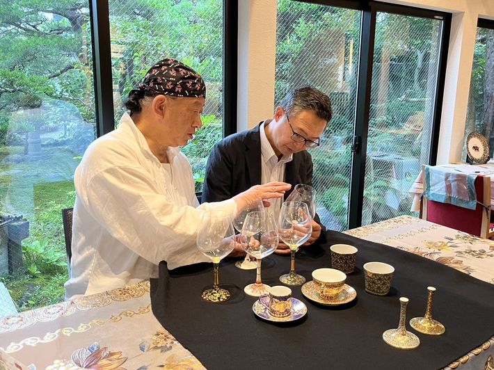 石川・九谷焼の窯元「鏑木商舗」の鏑木基由当主との打ち合わせの様子。野村さんは今後、ジュエリーの商品開発にも力を入れていくという