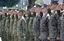 実動訓練「レゾリュート・ドラゴン」の開始式に臨む陸上自衛隊(奥)と米海兵隊の隊員ら=2024年7月28日午前、熊本市の陸自健軍駐屯地