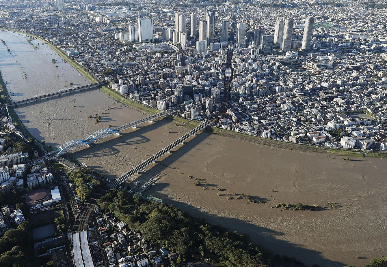 台風19号の影響で水位が上がった多摩川の丸子橋(手前から2本目)付近=2019年10月13日、手前は東京都大田区、奥は川崎市中原区(共同通信社ヘリから)