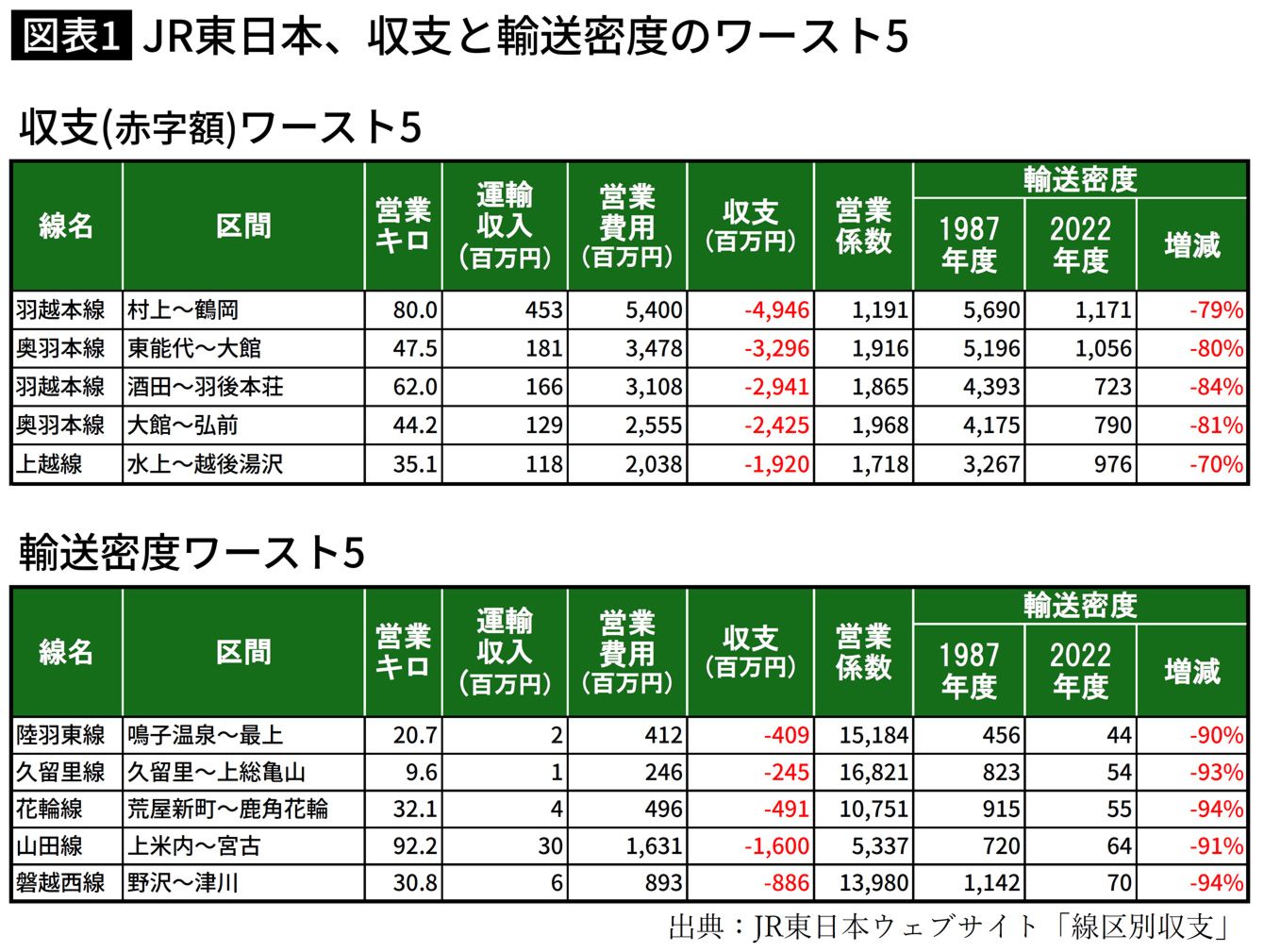 2位は秋田県「東能代―大館間」で32億円、1位は…業績好調のJR東日本が直面する「赤字ローカル線区」ワースト3