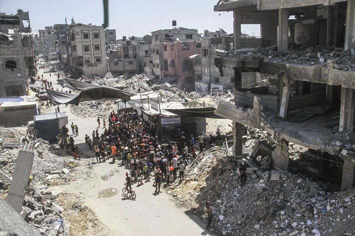 2024年8月26日、ガザ地区北部のジャバリア難民キャンプで、食糧支援を受けようと集まる人々