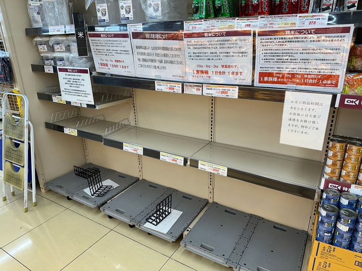 空っぽのコメ売り場。編集部員もコメを求めて、スーパーを何軒も回ったが購入できなかった(2024年8月25日、埼玉県)