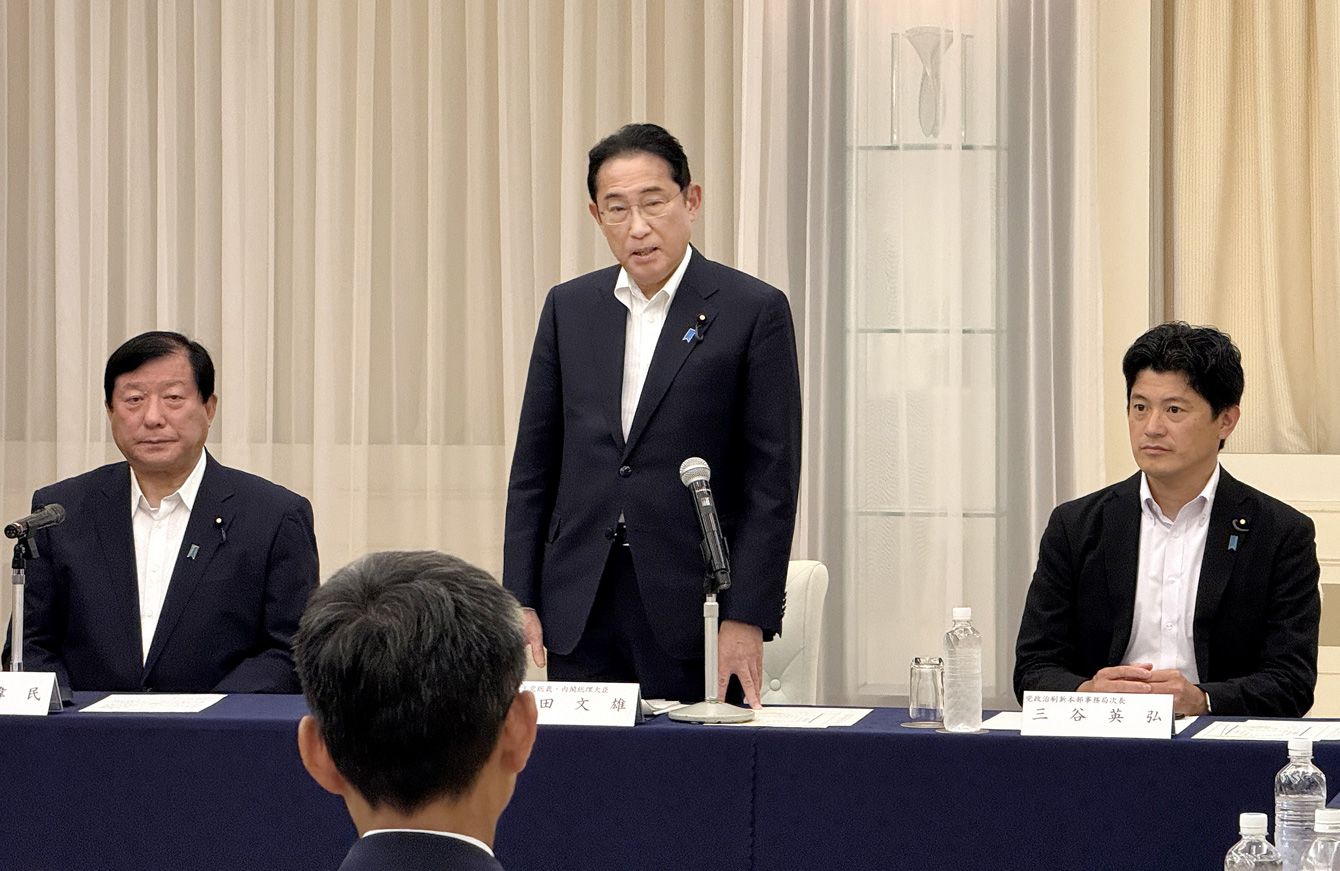 自民党福島県連との政治刷新車座対話であいさつする岸田文雄首相(中央)=2024年8月24日午後、同県いわき市