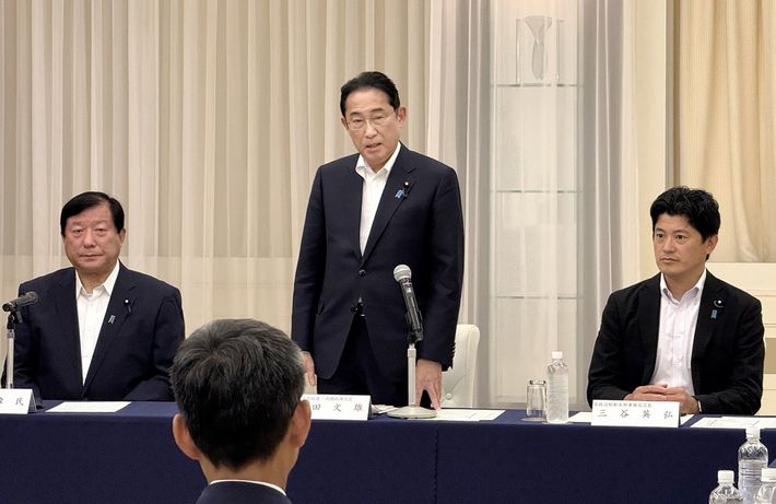 自民党福島県連との政治刷新車座対話であいさつする岸田文雄首相(中央)=2024年8月24日午後、同県いわき市