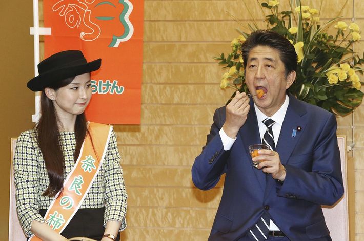 奈良県産の柿を試食した安倍首相は「いつもよりジューシー」とコメント。左は「奈良の柿PRレディ」の朝倉理恵さん=2019年11月14日、首相官邸