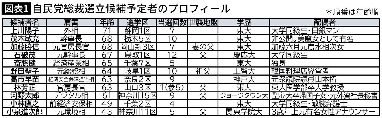 女性アナ、美魔女、韓国料理店経営者、敏腕弁護士…自民総裁選立候補予定者「配偶者と学歴」が味わい深い