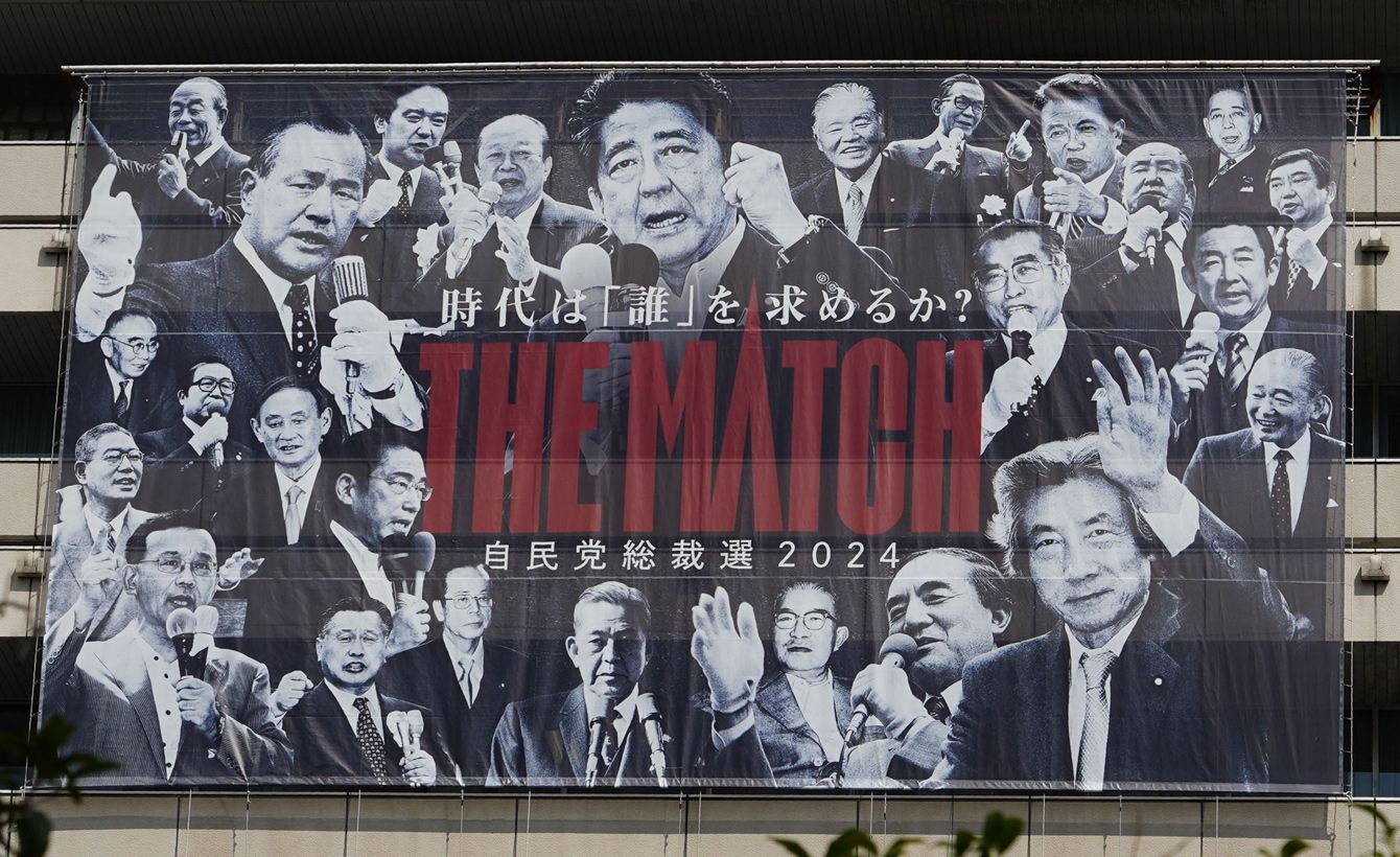 自民党本部の外壁に掲げられた総裁選の横断幕=2024年9月12日午前、東京・永田町