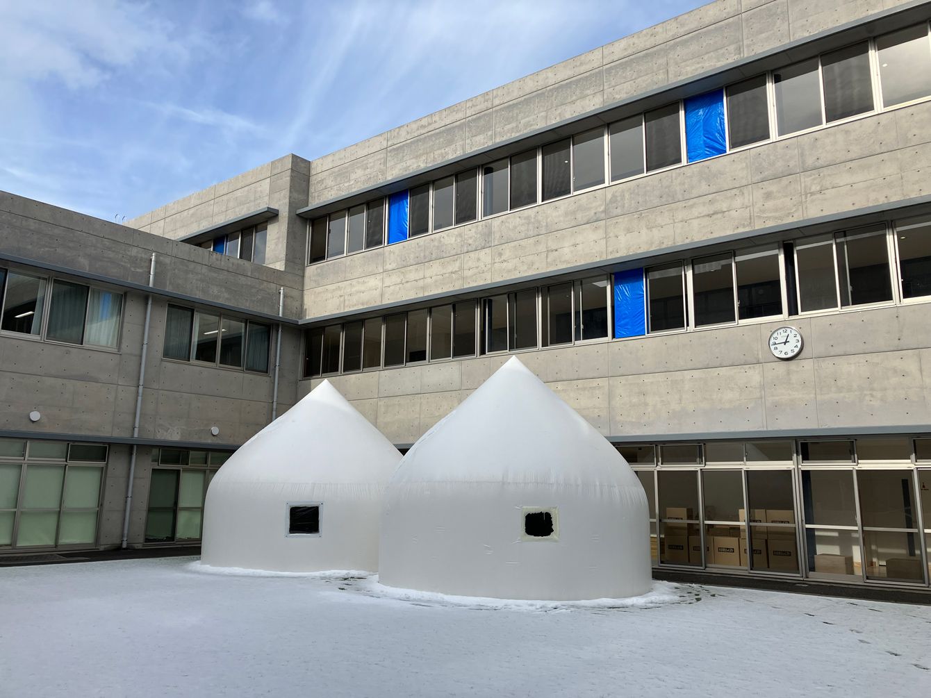 輪島中学校のアリーナ(体育館)に設置された屋内用のインスタントハウス。