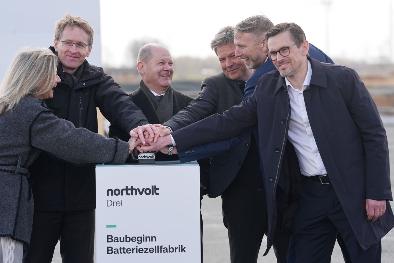 2024年3月25日、2026年から電気自動車用のバッテリーセルを生産するノースボルト工場の公式着工式に出席したショルツ首相とハベック経済相。