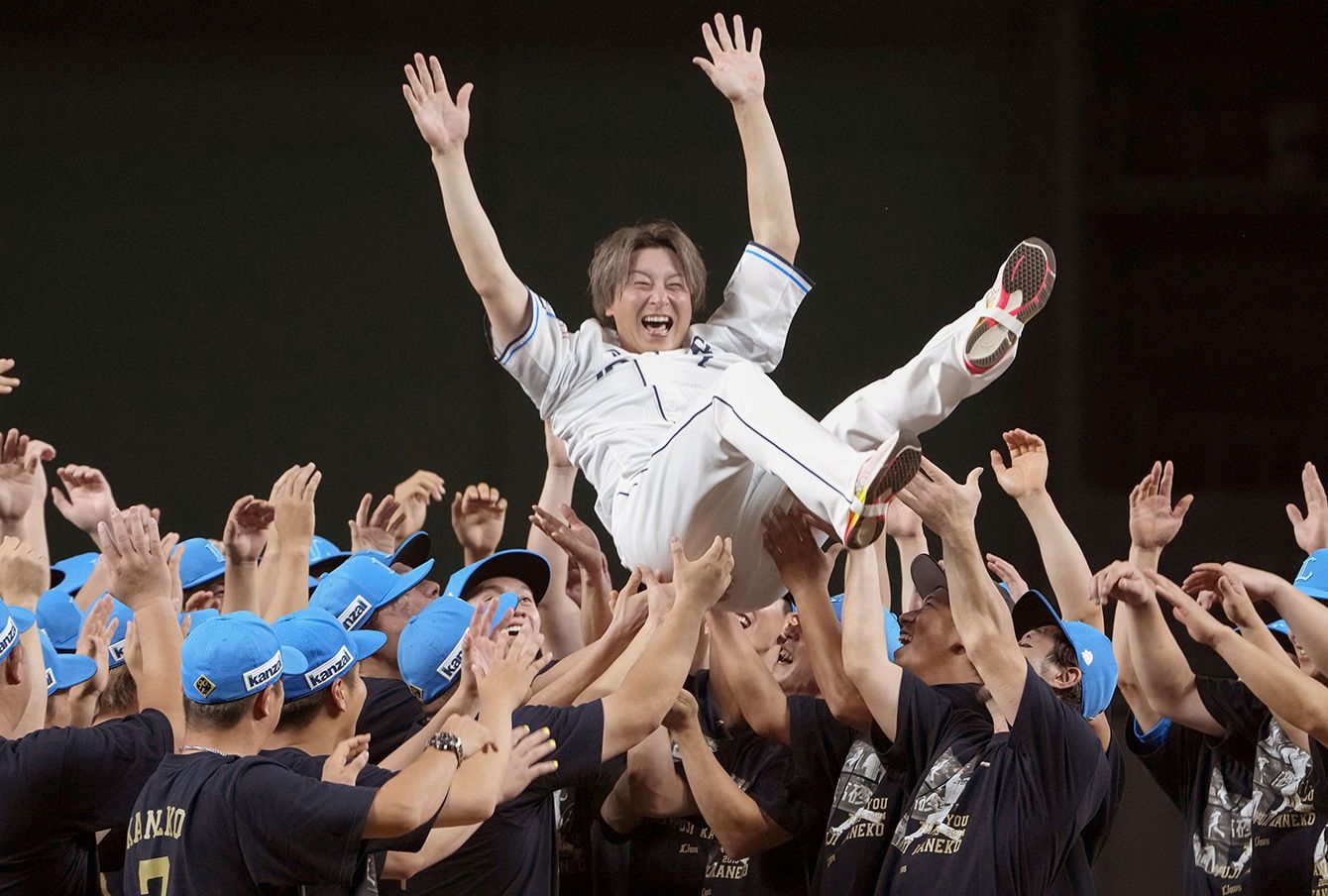 引退試合を終え、ナインに胴上げされる西武・金子侑司=2024年9月15日、ベルーナドーム