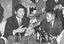 米大リーグのジャイアンツでメジャーデビューし、羽田空港で記者会見する村上雅則投手(左)=1964年12月、共同通信