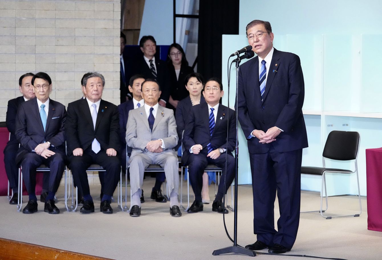 自民党総裁選後に開かれた両院議員総会であいさつする石破茂新総裁=2024年9月27日午後3時30分、東京・永田町の党本部