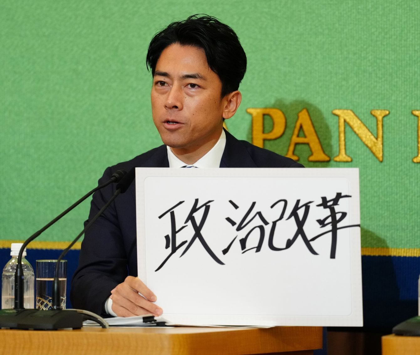 自民党総裁選立候補者討論会で、パネルを手に発言する小泉進次郎元環境相=2024年9月14日、東京都千代田区の日本記者クラブ[代表撮影]