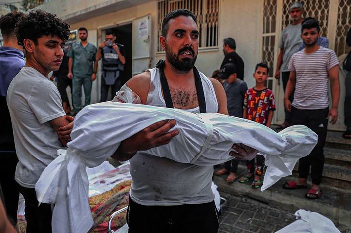 砲撃で死亡したパレスチナ人の子供の遺体を運ぶ男性(写真=Saleh Najm and Anas Sharif/CC-BY-4.0/