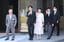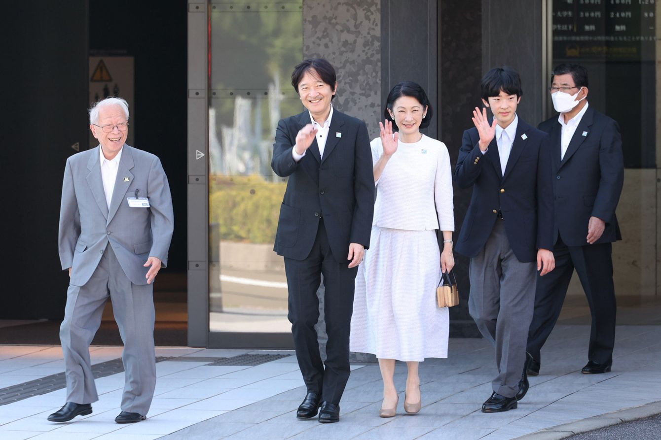 岐阜関ケ原古戦場記念館に到着された秋篠宮ご夫妻と長男悠仁さま。左端は同館の小和田哲男館長、右端は岐阜県の古田肇知事=2024年8月1日、岐阜県関ケ原町[代表撮影]