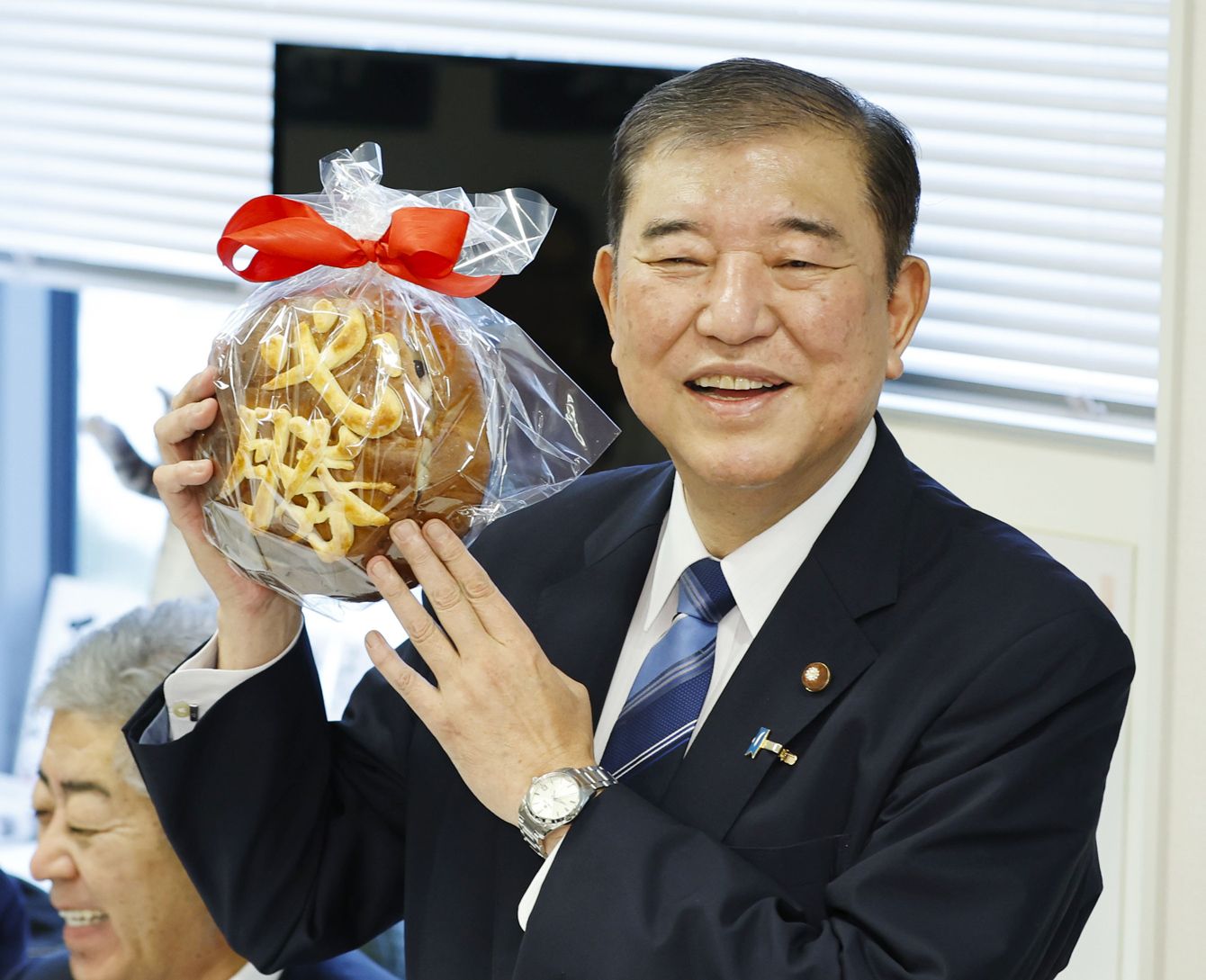 自民党総裁選の選対会合で、「必勝」パンを手に笑顔を見せる石破茂氏=2024年9月27日午前8時35分、国会
