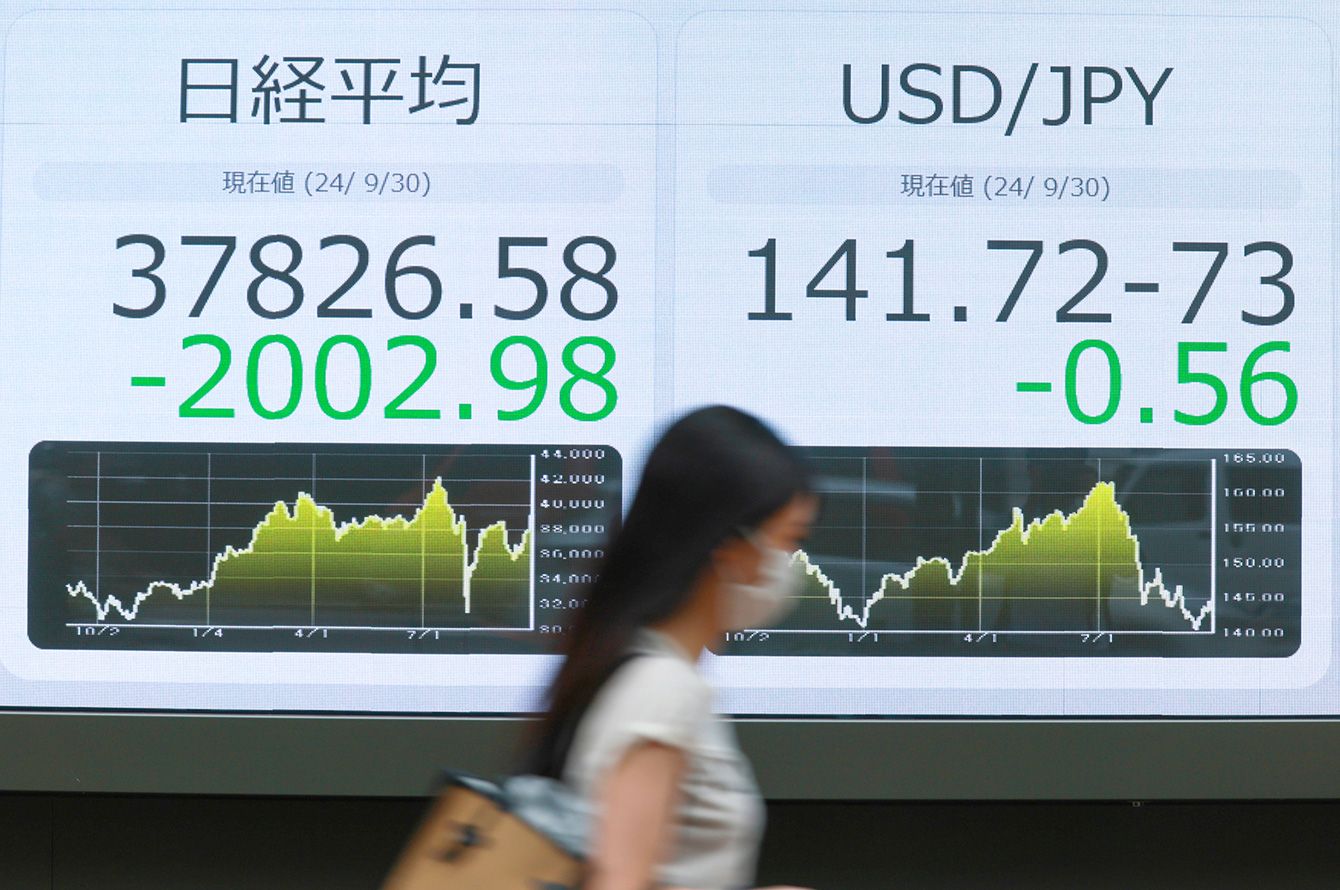 下落した日経平均株価(左)と1ドル=141円台後半に上昇した円相場を示すモニター=2024年9月30日午後、東京都中央区