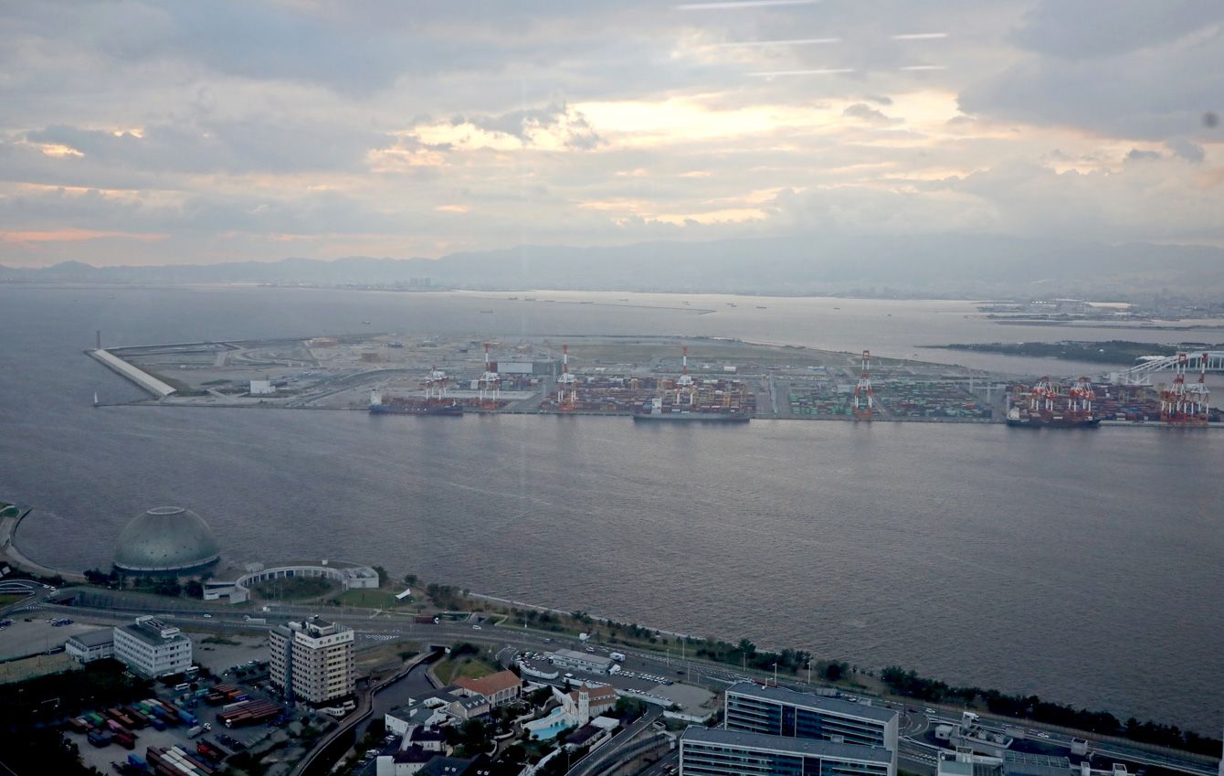 大阪府庁咲洲庁舎(大阪市住之江区)から見た人工島・夢洲(中央)=2023年9月28日、大阪府
