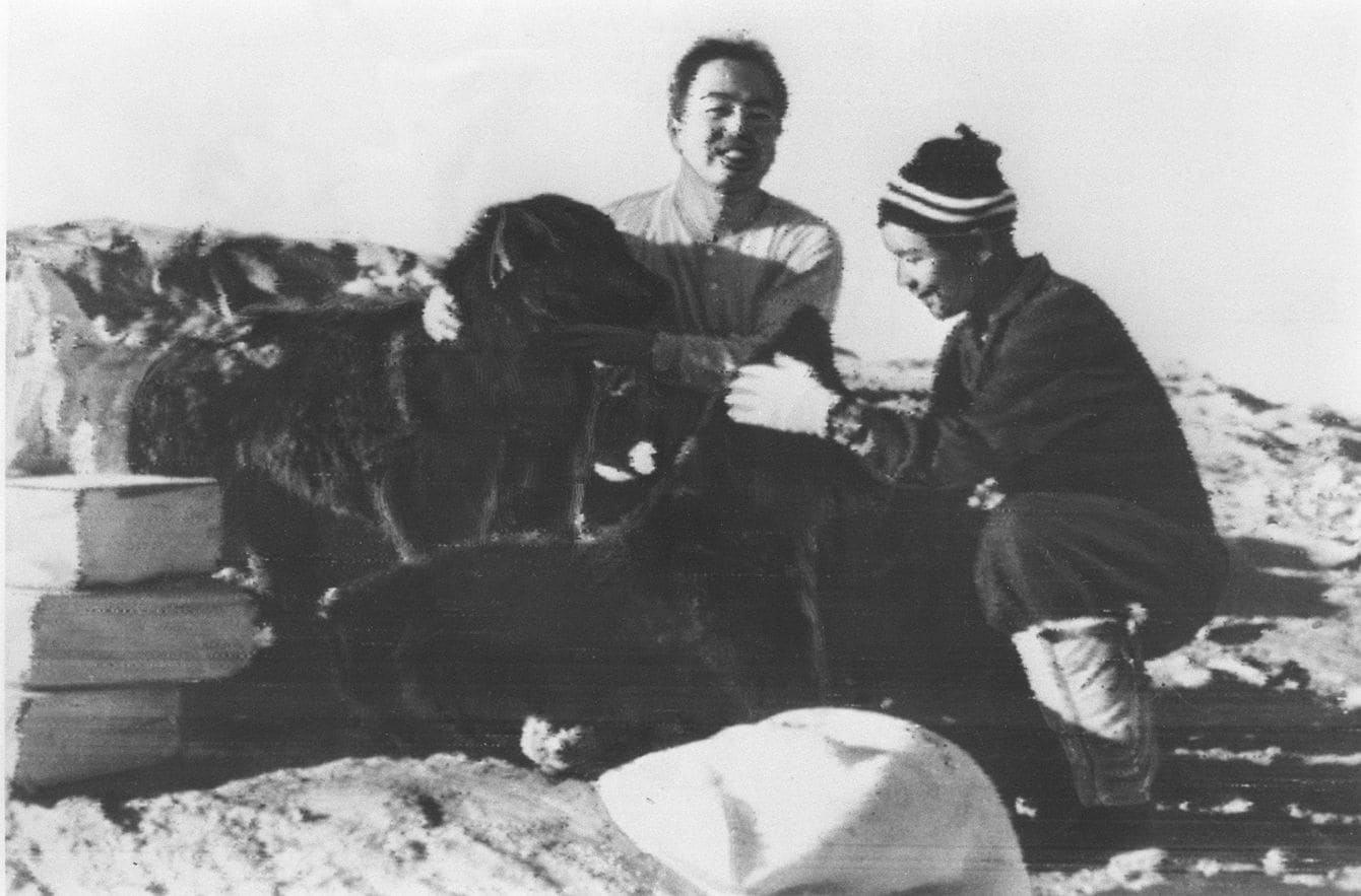 1959年1月15日、再会したタロとジロを抱き寄せる南極観測隊員。2頭は前年1958年2月に第2次南極観測隊が越冬を断念した際、昭和基地に置き去りにされた15頭のうちの2頭(南極)
