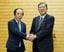 日銀の植田総裁(左)と握手する石破首相=2024年10月2日午後、首相官邸