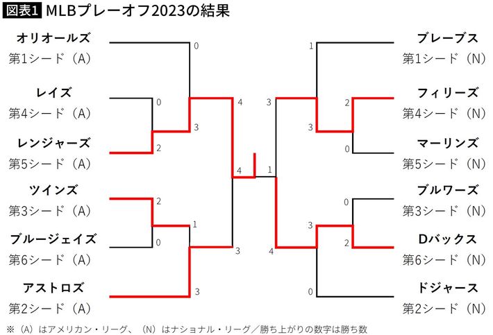 ワイルドカード2番手(第5シード)でプレーオフに進出したレンジャースがワールドシリーズ優勝となった。(プレジデントオンライン編集部作成)