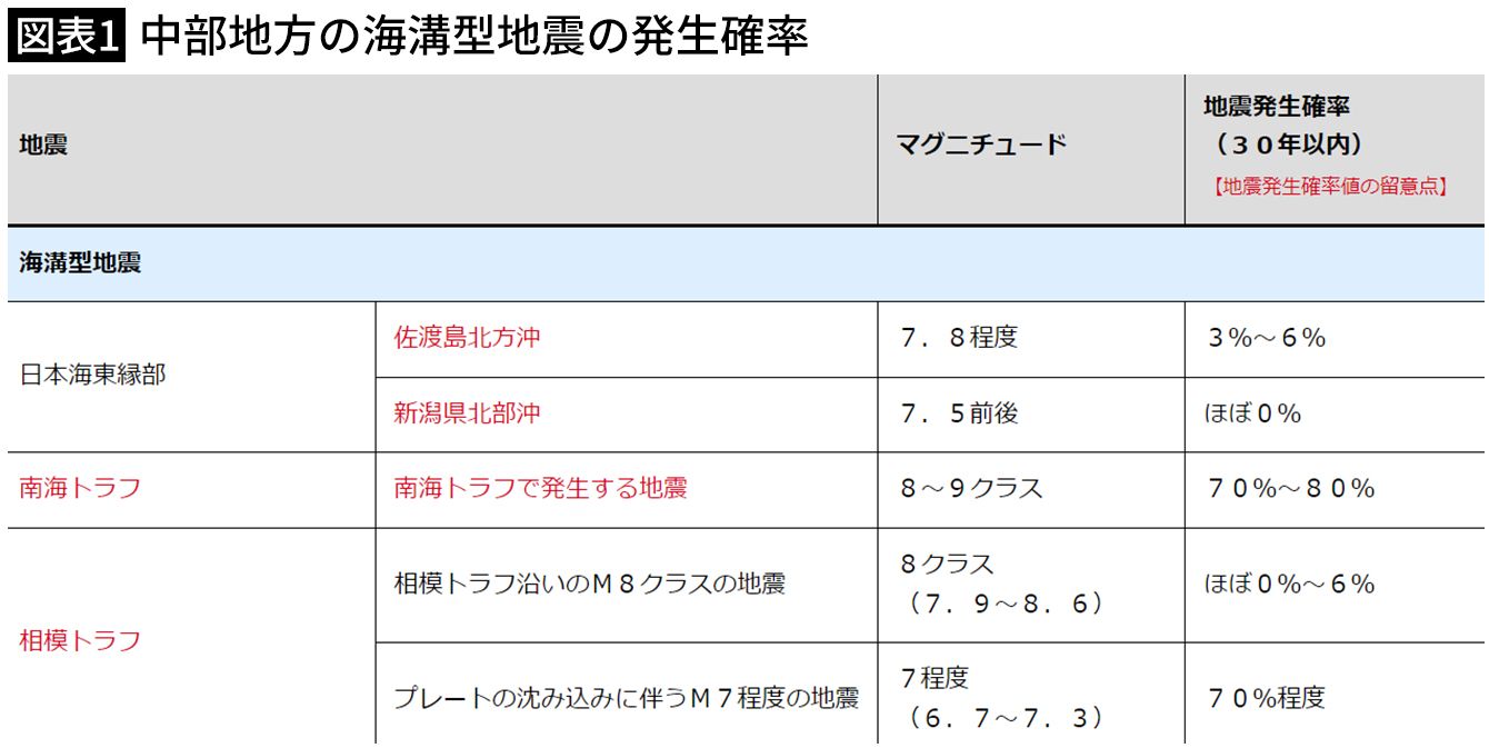 がHPで公表している中部地方の海溝型地震の発生確率。南海トラフは「70~80%」とされている。