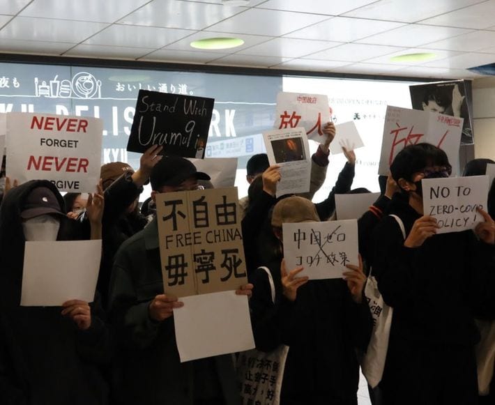 2022年11月27日、本国での白紙運動に呼応して日本の新宿駅西口地下でおこなわれた在日中国人の若者らの抗議活動
