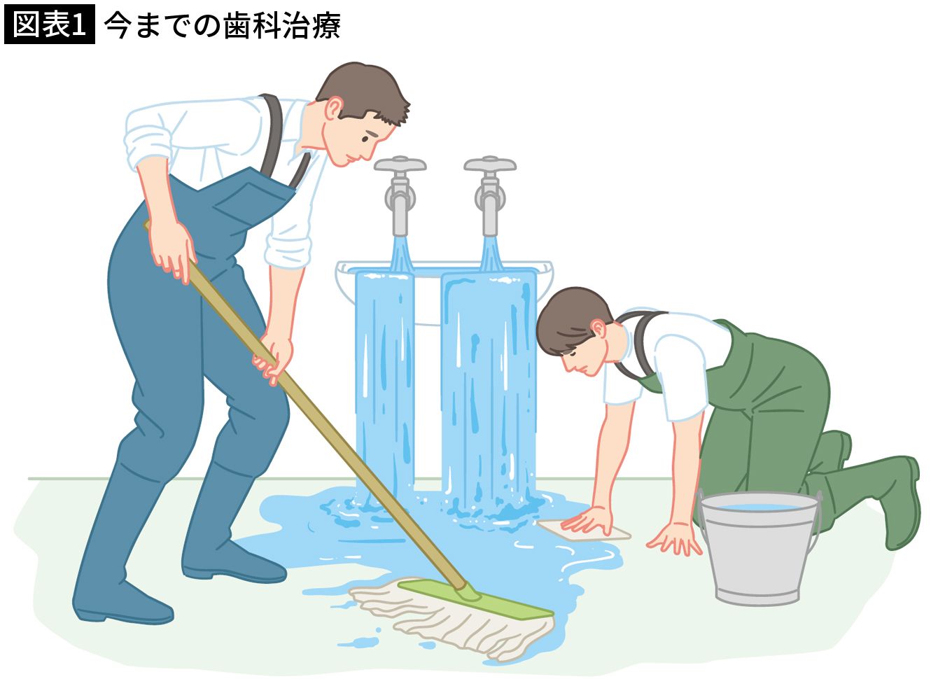 受け皿(虫歯のなりやすさ)を変えずに床を拭き続けてきた(対症療法)のが日本の歯科治療。[出所=『