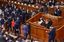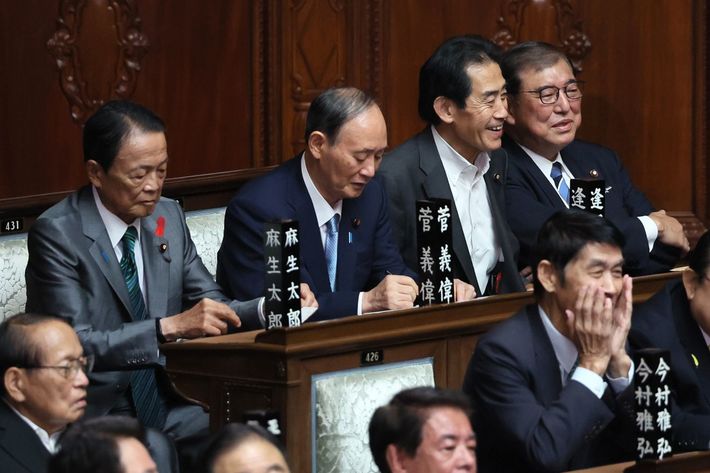 首相指名選挙が行われる衆院本会議に臨む自民党の石破茂総裁(上段右端)ら。同左端は麻生太郎氏=2024年10月1日午後、国会内