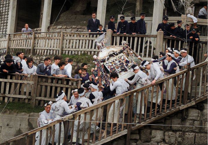 1954年(昭和29)の山神祭。端島神社から山車を担いで下る