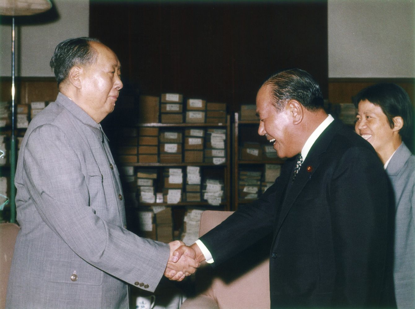 中国北京・中南海の毛沢東主席の自宅で毛主席(左)と握手する田中角栄首相(=1972年9月27日、中国・北京)