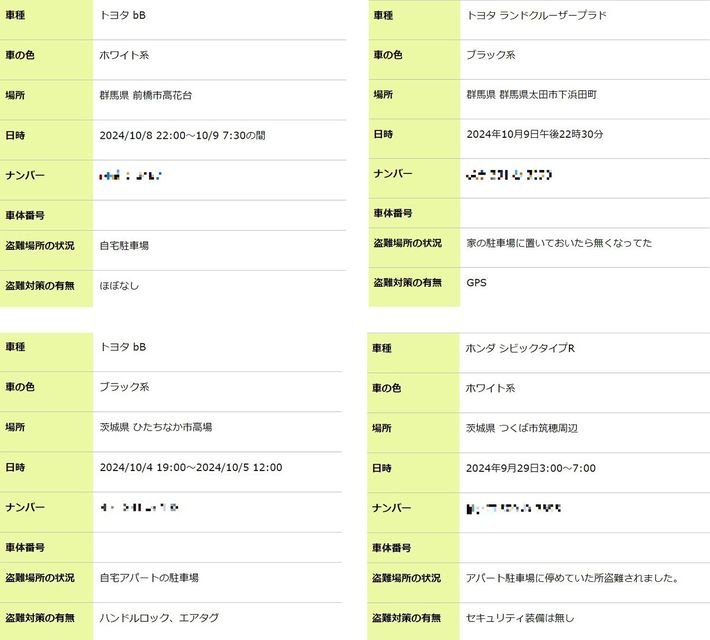 に寄せられている被害報告の一部(※車のナンバー欄を加工)。盗難対策「ほぼなし」といった回答も目立つ
