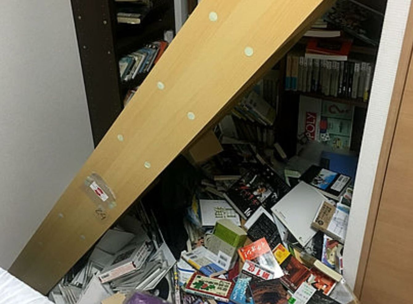 被災後の室内の様子。本棚が倒れ、大量の本が落下している