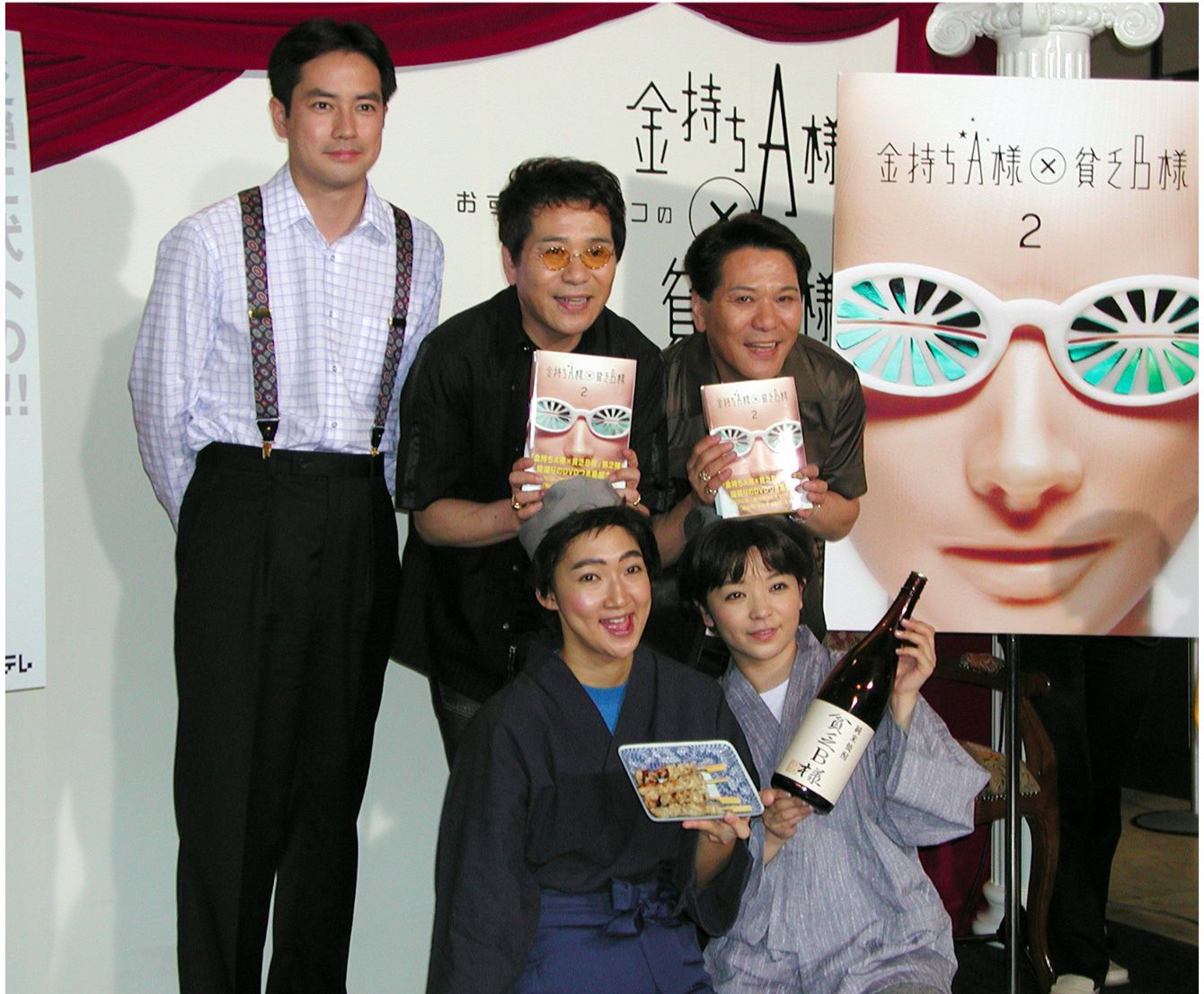 「金持ちA様×貧乏B様2」をPRするおすぎとピーコ、羽鳥慎一アナウンサー(後列右から)、北陽の2人(前列)=東京・汐留の日本テレビ 2004年